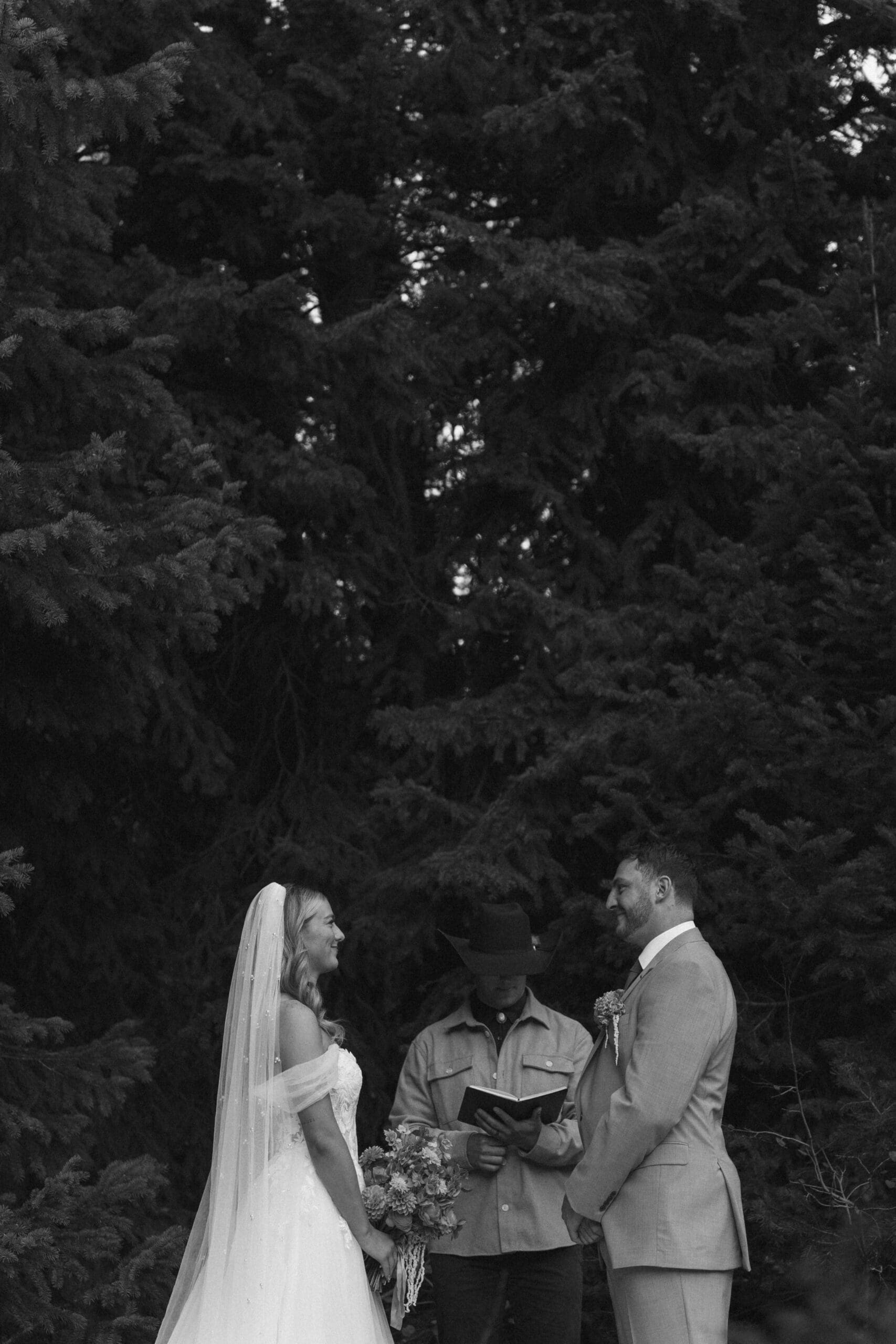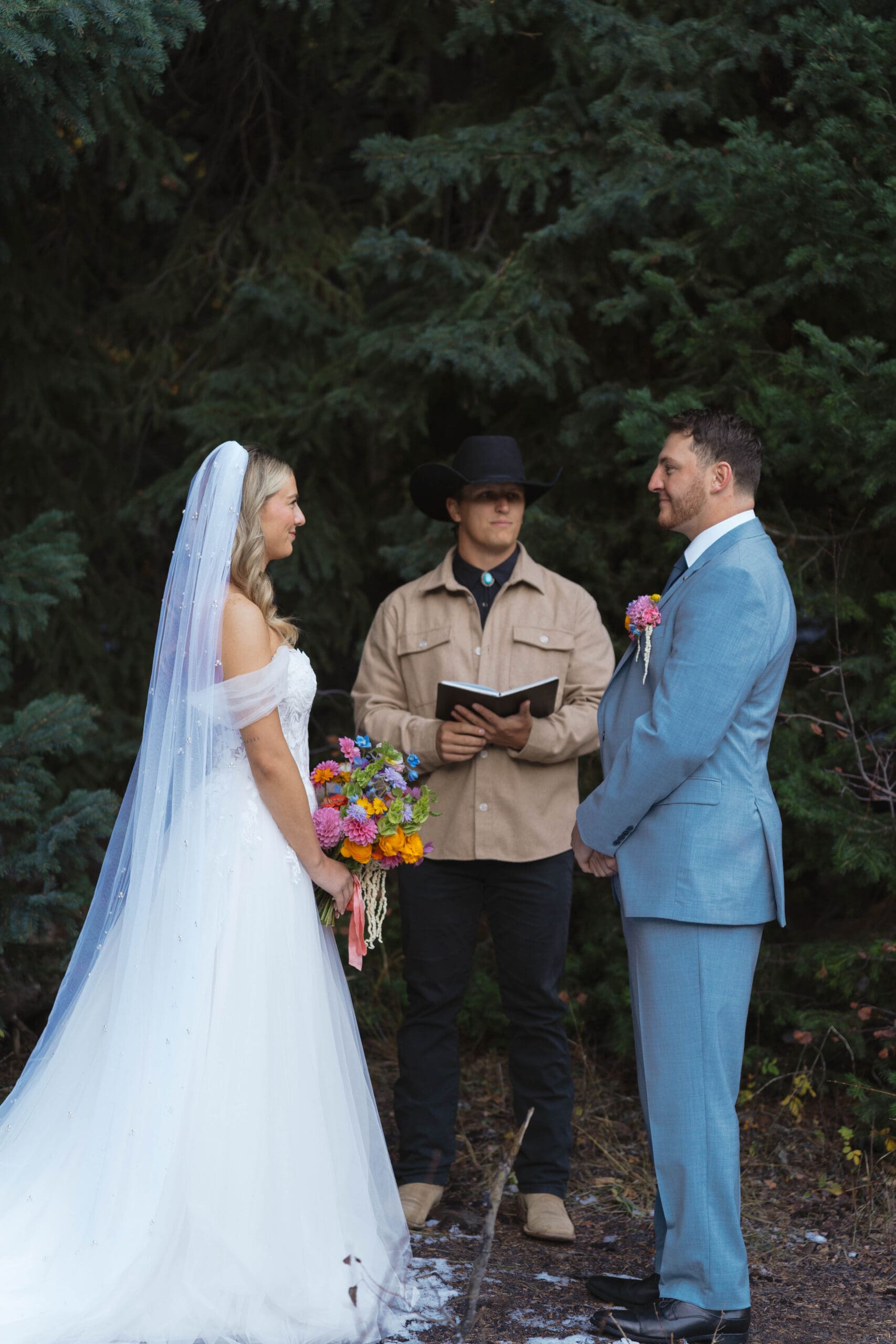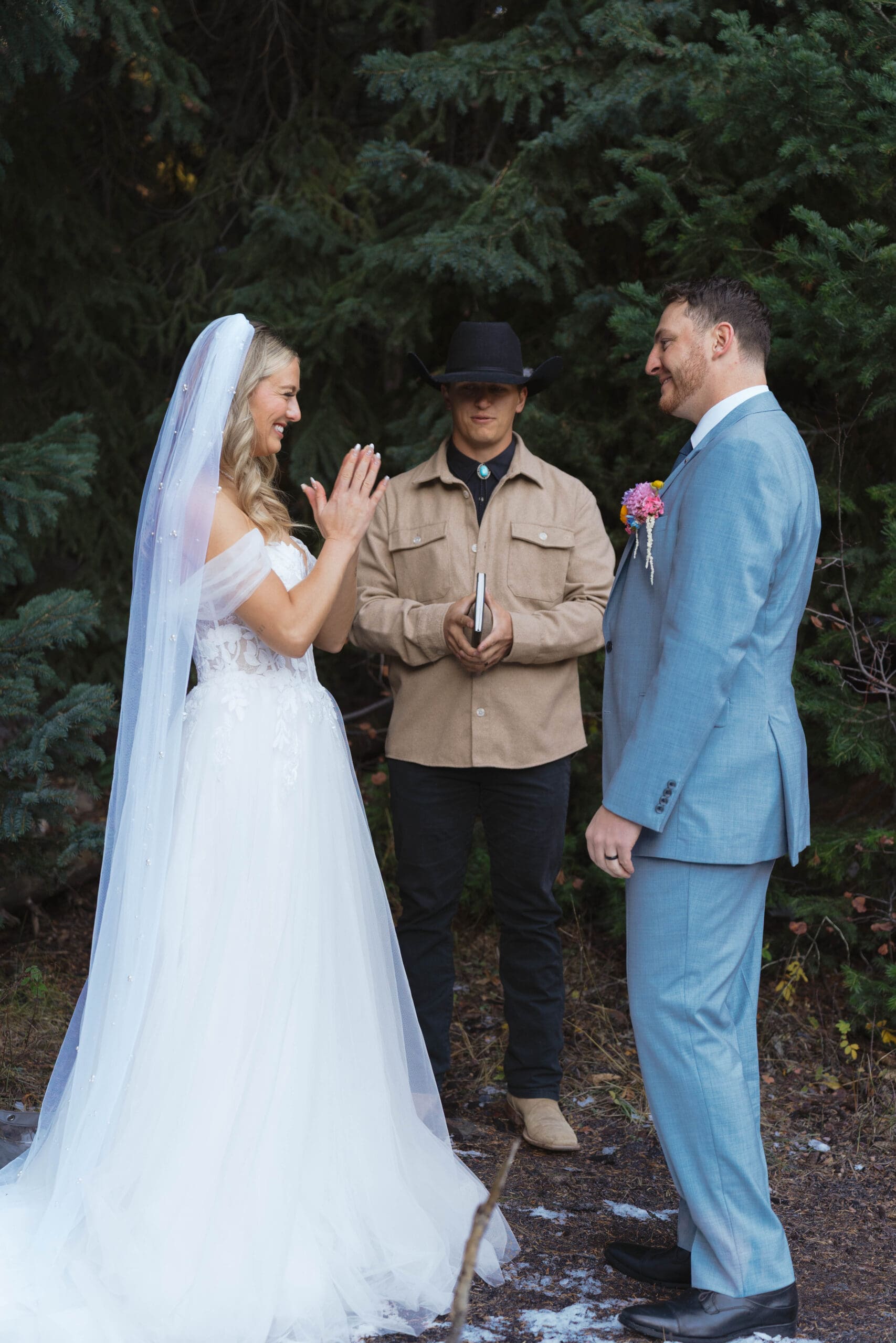 As the sun started to rise, the sky softened into pastel colors, lighting up the pines and mountain peaks. The couple exchanged vows in a quiet clearing with no one else around—just the sound of the creek, the birds waking up, and the sun peeking over the canyon.